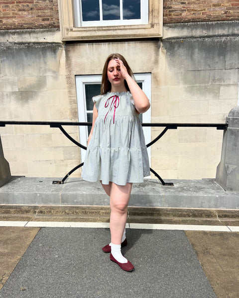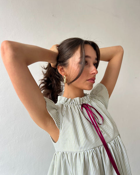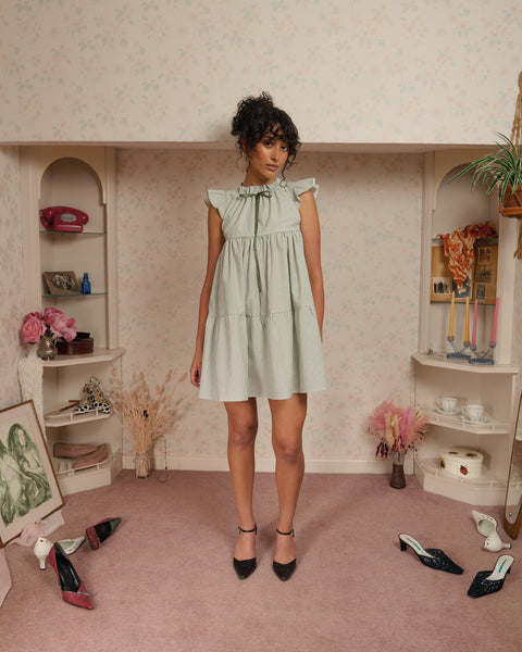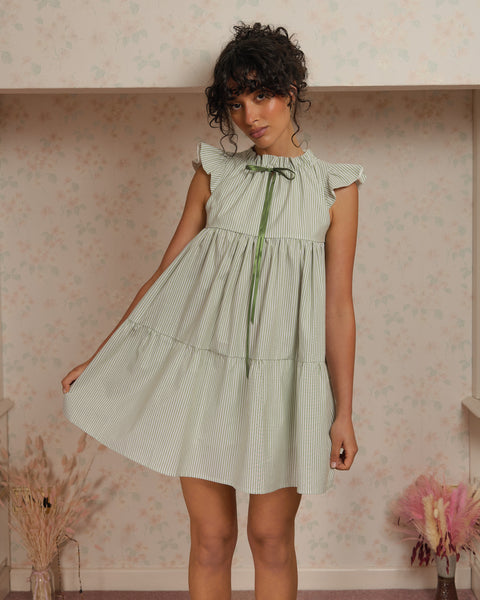 The Savannah dress in Sage Stripe is a light, floaty babydoll summer staple made from 100% cotton. It features delicate flutter sleeves, a gathered tiered skirt, in the cutest mini length that’s easy to wear and endlessly comfortable.