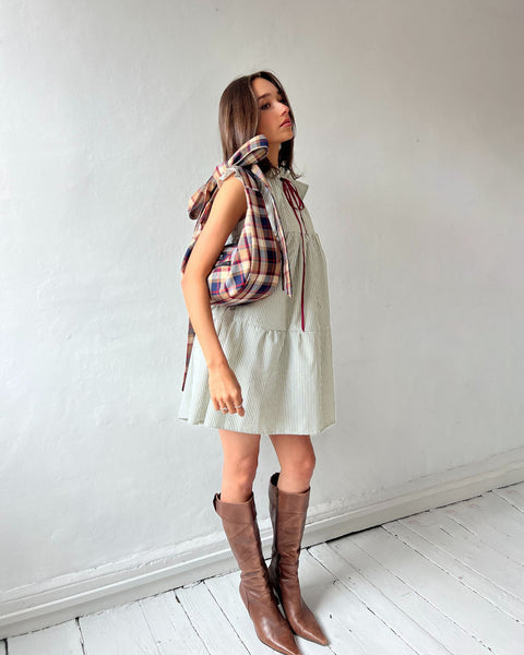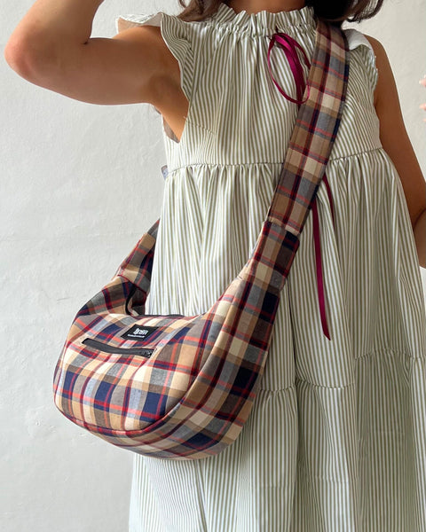 The Milo Bag is the perfect everyday bag featuring long adjustable straps to be tied with a bow, full zip closure and outer zip pocket. Featured in a beautiful brown and blueberry tartan and lined with wadding and 100% organic black cotton.