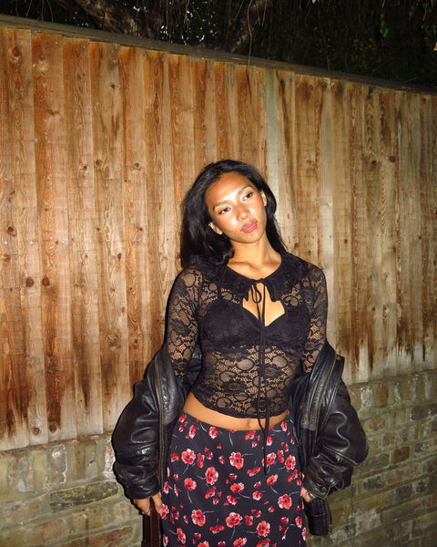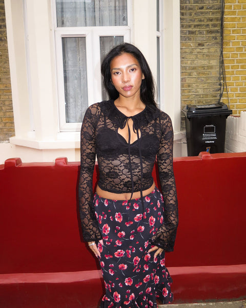 Playful and dramatic, The Marni Top is crafted from a smooth corded lace with 4 way stretch.